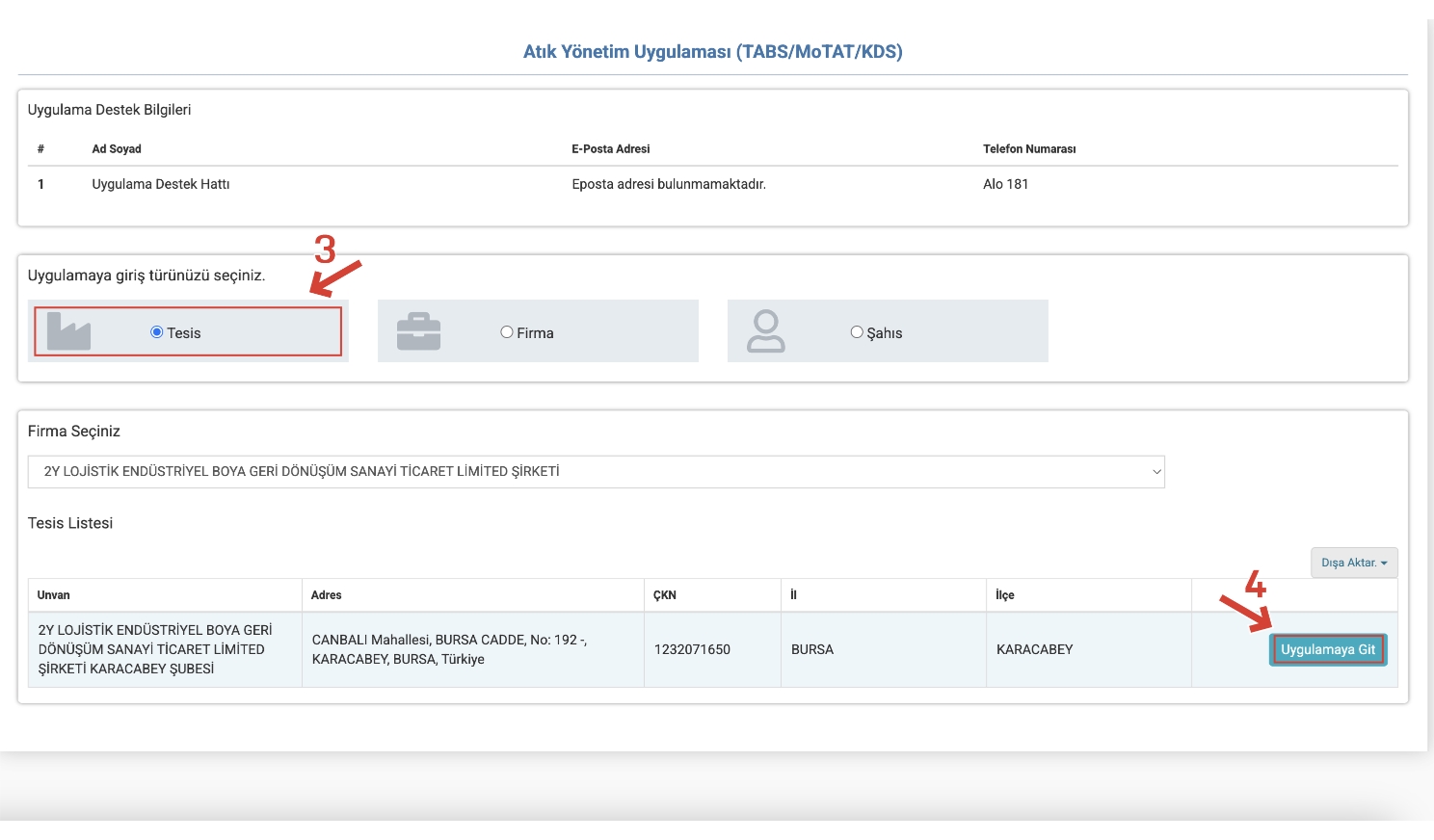 Uygulama türünde tesis seçilecek olup, aşağıda yer alan tesis listesinden hangi şube/tesisten atık gönderimi yapılıyorsa seçilip uygulamaya git sekmesi ile tesise ait olan uygulamaya gidilmelidir.